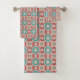 A Tiled Retro Modern Pattern Of Squares and Circles In White, Teal And Red Bath Towel Set For The Bathroom Decor