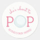 Un pegatina de ducha de bebé con el texto "está a punto de ser POP" con el ilustracion de una burbuja incorporada en el diseño. Personalice el nombre. Las invitaciones coincidentes y otros artículos están disponibles en Jill's Paperie.