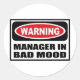 ADMINISTRADOR DE ADVERTENCIAS EN EL Pegatina DE MALO MÁS MALO puedes personalizar en www.WarningSignShirts.com y presenta un signo de advertencia rojo y negro y MANAGER IN BAD MOOD en letras negras audaces para avisar al mundo. También puede personalizar a su propio Pegatina de signos de advertencia con el texto que desee.