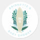 ¡Surfs up! Ducha de bebé con temática tropical para el surf gracias a un pegatina con una tabla de planchar de grano de madera natural y hojas tropicales en tonos azul y verde agua.