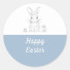 Un gracioso pegatina feliz de Pascua: viene con un lindo conejo en línea de arte y texto debajo de polvorientos tonos azules de fondo. El conejo está sentado en sus patas traseras con flores de margarita a ambos lados. ¡Esto también podría ser usado para primavera, cumpleaños, ducha de bebé o gracias!