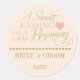 La boda favorece al pegatina en un diseño de oro rosa. Incluye la frase "Un dulce final a un nuevo comienzo", perfecta para un dulce favor o un dulce bar bufé