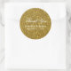 Boda Gracias Purpurina Pegatina De La Ronda Oro. Personalizar y Personalización añadiendo el nombre de la novia y el novio y la fecha del boda. Diseñado por nadil2 e impreso por Zazzle.También disponible en otras opciones de color.