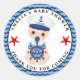 Este pegatina redondo clásico de la ducha de bebé está decorado en tonos marinos, rojos, azules, blancos y negros, con un diseño náutico. El pegatina está diseñado con un lindo bebé y el fondo de las olas, ideal para un niño fiesta de ducha. Puede personalizar el texto.