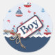 Colores náuticos en rojo clásico, blanco y azul con ancla y cangrejos y una etiqueta de novedad de niño con dos.