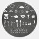 Herramientas de cocina esbozadas "desde la cocina" de un pegatina redondo sobre un fondo de pizarra.