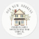 Hermosa casa de color crema y árboles se dirigen al pegatina de la etiqueta. Visita nuestra tienda para ver nuestras tarjetas de anuncios móviles.