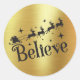 Este pegatina presenta a Santa y su reno volando en su trineo y tipografía que dice "Believe"/ El fondo es un Relieve metalizado de oro sucio. Estos elegantes pegatinas son perfectos para los bolsos de fiesta o sobres de tarjetas para Navidades.
