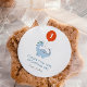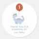 El Fiesta Pegatina Dinosaur 1st Birthday presenta un dinosaurio azul pastel con un globo rojo con el número 1 dentro del globo y el dicho, "Gracias por pasarlo". Personalizar con la edad y el nombre de su hijo.