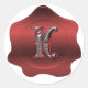 Elegante sello de cera roja se ve pegatina con gráficos de un tono plateado ornamentado y letra roja monograma K, en el medio. Bonito toque final a invitaciones especiales para ocasiones y sobres de tarjetas de felicitación.