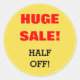 Este diseño de pegatina de venta redonda incluye los mensajes "¡ENORME VENTA!" y "¡MEDIA DESPEGADA!". Podría utilizarse en una tienda minorista para marcar que un artículo está en venta. El monto del descuento puede ser personalizado. Tiene texto rojo y negro sobre un fondo amarillo.