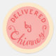 Este pegatina presenta letras festivas a mano que dicen "entregadas por chimenea" en texto rojo sobre un fondo rosado. Esto sería perfecto para un sello para sobres de tarjetas de Navidades o para decorar los regalos de sus Navidades para que parecieran haber sido entregados por correo aéreo del Polo Norte.