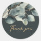 Añade un toque de elegancia a tus regalos de agradecimiento o favores de boda con este impresionante pegatina de follaje de eucalipto "Gracias". El diseño presenta delicadas hojas de eucaliptos con sutiles acentos dorados y un fondo verde oscuro y lujoso. Las palabras "Gracias" están escritas en un elegante guión escrito a mano en oro suave, creando una perfecta mezcla de sofisticación y calidez. Ya sea que esté sellando sobres o mejorando el embalaje a favor, este pegatina le añade un toque de acabado elegante y moderno a cualquier ocasión.