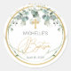 Elegante Pegatina redondo de vegetación para la celebración del bautismo. Este diseño cuenta con un ilustracion de follaje eucalipto de acuarela y una cruz de oro falsa.