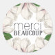 Diga gracias a los franceses por estos pegatinas florales. El texto dice "merci beaucoup" que se traduce como "muchas gracias". Las flores de magnolia antiguas en rosa y blanco le dan un toque de elegancia. ¡Ideal para bodas, duchas, fiestas y más!