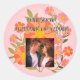 Gracias boda pegatina redondo por expresar con elegancia su gratitud a los que asistieron al boda. La foto de la novia y el novio está flanqueada por una exhibición multicolor de flores.