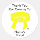 Utilice estos pegatinas redondos para decorar una bolsa de botín o para tratar bolsos para invitados en una fiesta temática de Artes Marciales, o para sellar el sobre cuando envíe tarjetas de agradecimiento después del fiesta. Ofrecemos estos en una selección de colores de cinturón de rango. (No veas el color de tu cinturón aquí? Envíenos un correo electrónico a info@MartialArtsPartyStore.com y crearemos pegatinas con el color de cinturón que necesita para su aprobación.) Introduzca aquí su nombre para que estos pegatinas sean personalizados para su invitado de honor. Para comprar las bolsas de botín de Artes Marciales y tarjetas de agradecimiento, visita www.MartialArtsPartyStore.com.