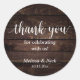 Gracias por celebrar con nosotros, Boda Pegatina, en caligrafía rústica de escritura, fiesta de cabaña, fondo de madera oscura.