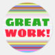 Este diseño pegatina presenta un patrón de rayas (o líneas) de varios colores. También muestra el motivador dicho "¡GRAN TRABAJO!" en texto de color verde y rojo. Tal vez profesores, educadores o tutores podrían usar a pegatinas como estos para reconocer y alentar a un estudiante que ha hecho un gran trabajo en una prueba, prueba, trabajo, proyecto o alguna otra tarea académica. [~Z0000117]