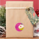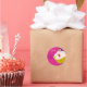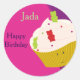 Pegatina con una tarta de oso de chicle sonriente. Este diseño tiene un fondo rosa y violeta. Este artículo muestra las palabras Feliz Cumpleaños y un nombre de personalizable.