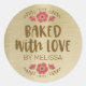 Una cosecha personalizada "horneada de amor" pegatina con un borde floral rosa sobre un fondo de textura dorada. Hazlo tuyo añadiendo tu propio nombre. Un toque de bonito para todos tus regalos hechos a mano. Diseñado para ti por Blackberry Boulevard.