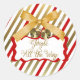 Los pegatinas redondos de Jingle All the Way presentan un arco dorado con dos campanas de jingle doradas sobre un fondo de rayas diagonales rojas, blancas y doradas con un cartel rojo y blanco con un texto dorado que dice Jingle All the Way. ¡Tenemos sobres, tarjetas de felicitación, etiquetas y sellos postales!