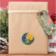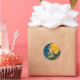 Una bruja muy bonito está volando por encima de una gran Luna de Cosecha en su escoba. Hay un búho en la escoba con ella. Parece vestida con coloridas ropas fiestas y una gorra no tradicional para una bruja. El cielo es brillante con las estrellas y la luna parece estar admirando la hermosa vista antes que él. Estos pegatinas serían perfectos para tus tarjetas de Halloween, invitaciones y bolsos de regalo para fiestas.