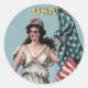 Pegatina redonda con una imagen vintage de la Dama de la Libertad usando un vestido blanco que fluye y sosteniendo una bandera estadounidense con la mano izquierda. Consulte pegatina rectangular, tarjeta de saludo, papel de confección y papel de envoltura. Ver toda la colección de Pegatinas del Día de la Independencia bajo la categoría CARDS & PEGATINAS en la sección VACACIONES.