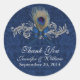 Elegante pegatina de novios, hecho en azul sobre damasco azul, con un tono plateado florido decorado con una pluma de pavo real y un arco azul. Personalice el texto gris claro para su día especial. Genial en tus favores de boda. Productos a juego disponibles.