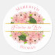 Añade un toque especial a tus bolsos de favoritas de boda con este pegatina redondo clásico. Cuenta con un ramo de rosas rosas y melocotones, claveles e hibiscos con un toque de vegetación muscular. Sus nombres están escritos en la parte superior e inferior del pegatina. Dentro de una franja blanca bordeada por un Relieve metalizado de oro están las palabras "Para siempre enamorado". Ese texto también es personalizable, así que puedes cambiarlo a cualquier otra cosa que quieras.
