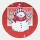 Un lindo muñeco de nieve con un beanie de rayas rojas y blancas y una bufanda roja y rosada con corazones de amor en ella. Él tiene la nariz de zanahoria y los palos para los brazos. Un pájaro azul se sienta en el brazo de palo del muñeco de nieve. El fondo es rojo con copos de nieve esparcidos al azar. Centrado en el fondo hay una hoja de notaciones musicales.