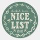 Este pegatina presenta un diseño con "Nice list" y "check two" escrito en crema sobre un fondo verde. Esto sería perfecto como pegatina de regalos de Navidades o para decorar paquetes o Navidades sobres de tarjetas para hacerlos parecer como si hubieran sido entregados desde el taller de Santa.