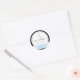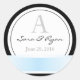 Pegatina boda redondo con borde negro grueso y una cinta azul a través de la parte inferior. Texto de personalizable para un monograma, nombre de novia y fecha de boda. Visita www.zazzle.com/daisylin712 para ver la invitación de boda coincidente y la tarjeta RSVP.