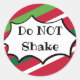 Todos tenemos un amigo o pariente que es un agitador de paquetes. Bueno, tratemos de hacerles parar con una advertencia con estos pegatinas. Las rayas rojas, blancas y verdes como fondo se coloca encima una burbuja de texto divertida con la advertencia interior. Diviértete un poco este año con risas y alegría.