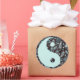 Pegatina redondo con la imagen de un símbolo yin y yang medio azul y medio vintage de los años 60 de un paisaje onírico azul y marrón. Ver confección, bolsa de favores, etiqueta de favor y papel de envoltura. Ver toda la colección de Pegatinas Psicodélicos de los años 60 en INVITES | Sección Pegatinas y etiquetas.