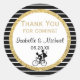 Una pareja joven en una bicicleta proporciona un toque de capricho en esta boda, por lo demás elegante, gracias pegatina. La pareja en realidad son niños y el chica está en la parte trasera de la bicicleta. El resto del pegatina boda incluye un marco purpurina dorado y rayas blancas y negras de moda. No tengas miedo de dejar que tu personalidad muestre un poco. Perfecto para una pareja que vive en bicicleta. Se verá genial en tus favores de boda, en la caja de pasteles bodas o en notas de agradecimiento.