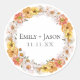 Este pegatina redondo presenta una hermosa corona floral pintada a mano que rodea los nombres de la pareja y la fecha del evento con una elegante y moderna letra. La corona está compuesta por suaves flores acuáticas en tonos melocotón, amarillos y ondulados, acentuadas por una delicada vegetación, que crean un diseño romántico e inspirado en la naturaleza. Los nombres de la pareja se muestran de forma destacada en el centro, con la fecha del evento enclavada debajo, lo que lo convierte en un toque final perfecto para favores de boda, invitaciones o bolsos de bienvenida. El motivo floral atemporal añade un toque de sofisticación, mientras que los detalles personalizados hacen de cada pegatina un verdadero placer para los huéspedes.