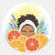 Este diseño pegatina presenta a una mujer elegante rodeada de mandarinas frescas y flores de lavanda suaves que simbolizan la belleza y la calma. Ideal para los amantes de la belleza, combina elegancia con un ambiente natural y refrescante.