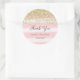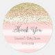 Pegatina redondo para la ducha de bebé con purpurina de oro falso y fondo de rayas rosas ruidosas.