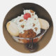 Cuenco de vidrio de helado de chocolate con bananas, crema de látigo, nueces y una cereza.