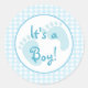 Pegatina redondo con una imagen de un bebé de gingham azul y pies de bebé azul en un círculo blanco con un borde azul. Texto opcional. Vea el papel de ajuste correspondiente. Ver toda la colección de Pegatinas de Kidz Korner en la categoría CARDS & PEGATINAS en la sección KIDZ KORNER.
