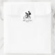 La silueta negra y aguda muestra a un niño y a un chica en una bicicleta. El niño está esparciendo y el chica está parado en la rueda trasera sujetándolo. Adorable pegatina boda para una pareja que ama montar en bicicleta juntos. Sus nombres están escritos a continuación en un guión bajo y luego en la fecha de su boda. Puede personalizar fácilmente el texto y los colores de fondo para que coincidan con los colores bodas.