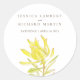 Hermosa acuarela primavera tulipán amarillo leucadendron boda pegatina. Personaliza con el nombre de tu novia y de tu novio y la fecha de boda. Parte del conjunto estacionario del boda de flores de color acuático de leucadendron amarillo. © Arte y diseño de las acuarelas originales de Sarah Trett. www.sarahtrett.com para www.mylittleedenweddings.com