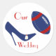 Divertidos pegatinas de sellos para sobres con temas de fútbol invitan a participar. Hecho en forma redonda, con un fondo blanco y gráficos de un fútbol rojo y azul siendo pateado con un elegante estilete azul en tacón alto. El texto rojo dice Nuestro Boda. Personalice el texto para su evento.
