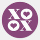 Este pegatina de círculo es perfecto para el El día de San Valentín. Presenta un tipo blanco audaz con corazones en el centro del o's sobre un fondo morado. Es un sello perfecto para las bolsas y las tarjetas de regalo.