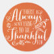 Rústico pegatina de Acción de Gracias con un guión caprichoso en un fondo de ropa de naranja. Este elemento está disponible en otras texturas de fondo y colores.