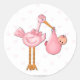 Diseño de bebé rosado para una bebé con una cigüeña que lleva a una bebé con fondo de corazón rosado. Gran sello para sobres para invitaciones a la ducha de bebé o anuncios de nacimiento.