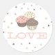 Un pegatina agradable con un trío de quequitos rodeados de rociadores en forma de corazón.