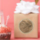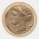 Pegatina redonda con la imagen de un antiguo tetradracmo siracústico con la cabeza de la ninfa Arethusa rodeada de cuatro delfines nadadores con un brillante borde plateado sobre el oro. Consulte confección, etiqueta de favor y papel de envoltura correspondiente. Ver toda la colección de Pegatinas de Toga en INVITES | Sección Pegatinas y etiquetas.