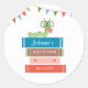 Este moderno y colorido pegatina es ideal para celebrar un Baby Shower con el tema "Traigan un libro para el bebé". Cuenta con una pila de libros con una adorable lombriz de libros encima usando grandes gafas y corbata de arco. Una inclinación en la parte superior da un aspecto festivo. Esta invitación unisex le ayudará a construir la biblioteca blanca del bebé que alberga un evento elegante.